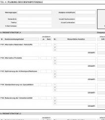 Tool zur Analyse und Bewertung von Einsparpotenzialen bei zeichnungsgebundenen Teilen, inklusive Risikoabschlägen, Bewertung der Umsetzungskosten und Zusammenfassung der Ergebnisse