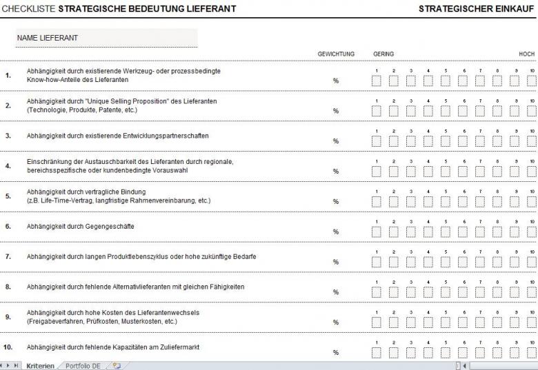 CHECKLISTE zur Abschätzung der strategischen Bedeutung eines Lieferanten - 10 Kriterien (DEUTSCH)