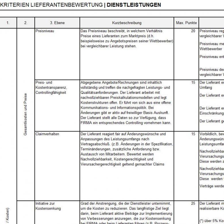 Kriterienset zur Beurteilung der Leistungen von Dienstleistern - 22 gewichtete Kriterien (DEUTSCH)