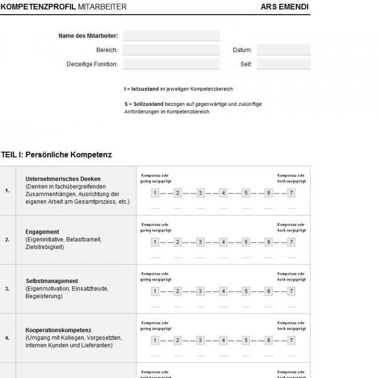Detaillierte Beurteilung der Kompentenzen eines Mitarbeiters. Sehr gut geeignet als Leitfaden für die Durchführung des Mitarbeitergesprächs.