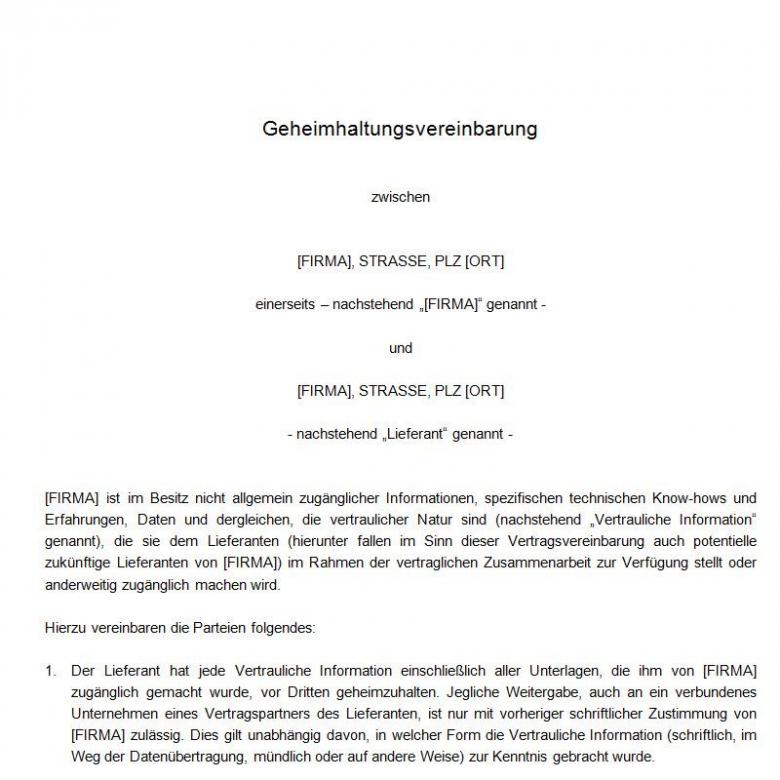 Vorlage einer Geheimhaltungsvereinbarung mit Lieferanten (Kurzversion)